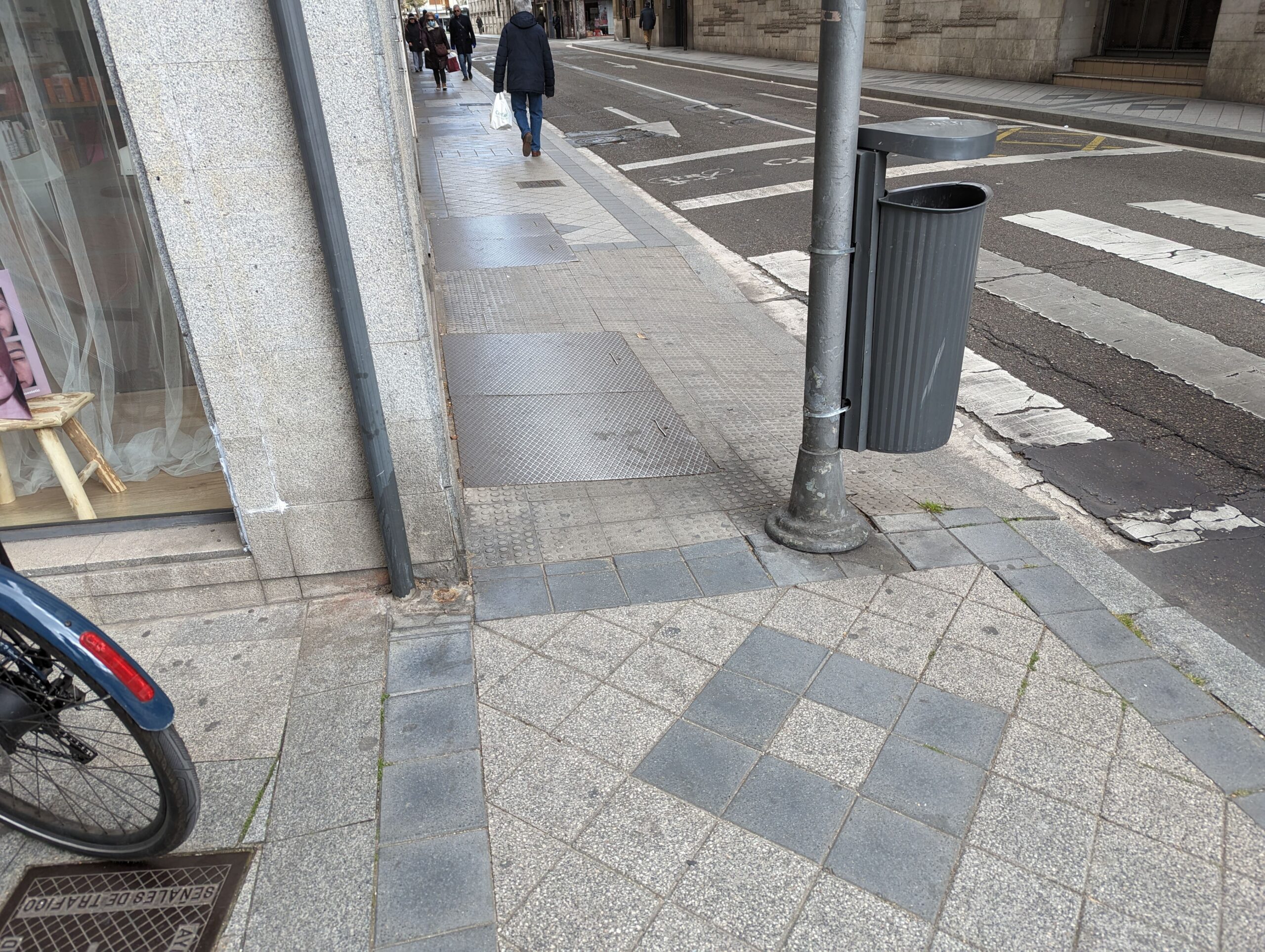 En Valladolid, muchas líneas de fachada están obstruidas por objetos extraños. Además, nuevos encaminamientos podotáctiles se implantan de forma incorrecta (ver imagen) y algunos encaminamientos antiguos se eliminan para dar más espacio a terrazas (reciente caso frente al edificio Lucense en el Paseo de Zorrilla).